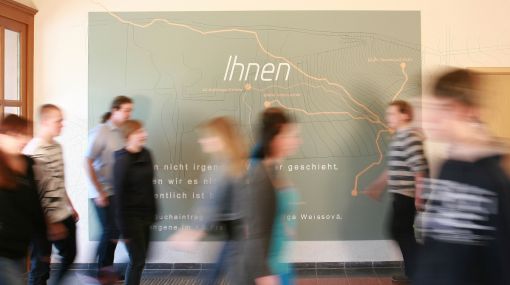 Fotoaufnahme für Postkarte der Gedenkwand im Beruflichen Schulzentrum „Julius Weisbach“ in Freiberg; Denkmal zur Erinnerung an das ehemalige Außenlager des KZ Flossenbürg (1945) auf dem heutigen Schulgelände.